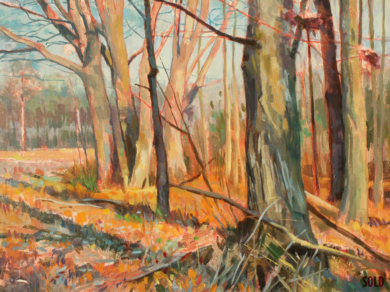I try to capture the immediacy and intimacy I feel with the natural world and my sense of place within it. I trained and worked as an illustrator for half of my life. I paint now with oil on canvas, linen or wood surfaces that I prepare myself. This manual process is important to my creativity. I like to connect with the surfaces that will hold the images I want to re-create – those images, patterns, colours, and sensations that the world all around us inspire in me.