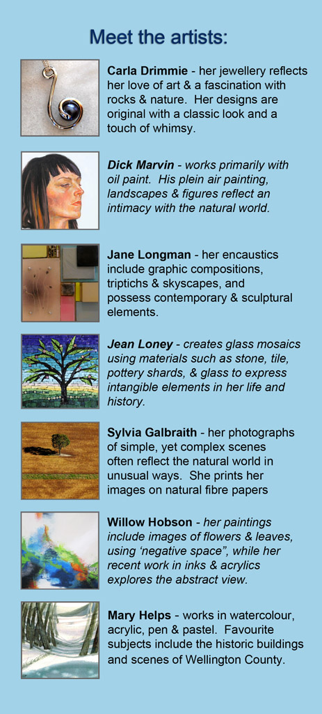 The Harris Artists Collective is a group of 35 artists working in a variety of media out of the Elora Centre for the Arts. Recently in an effort to display the work of the artists in the collective in a more meaningful way, the collective was divided into 5 groups. Starting Jan. 5, 2012 and running till February 12 the first group show entitled “Seven by Seven” will take place at the Elora Centre. There will be an opening reception on Sunday Jan. 8 from 2:00 to 4:00 P.M.